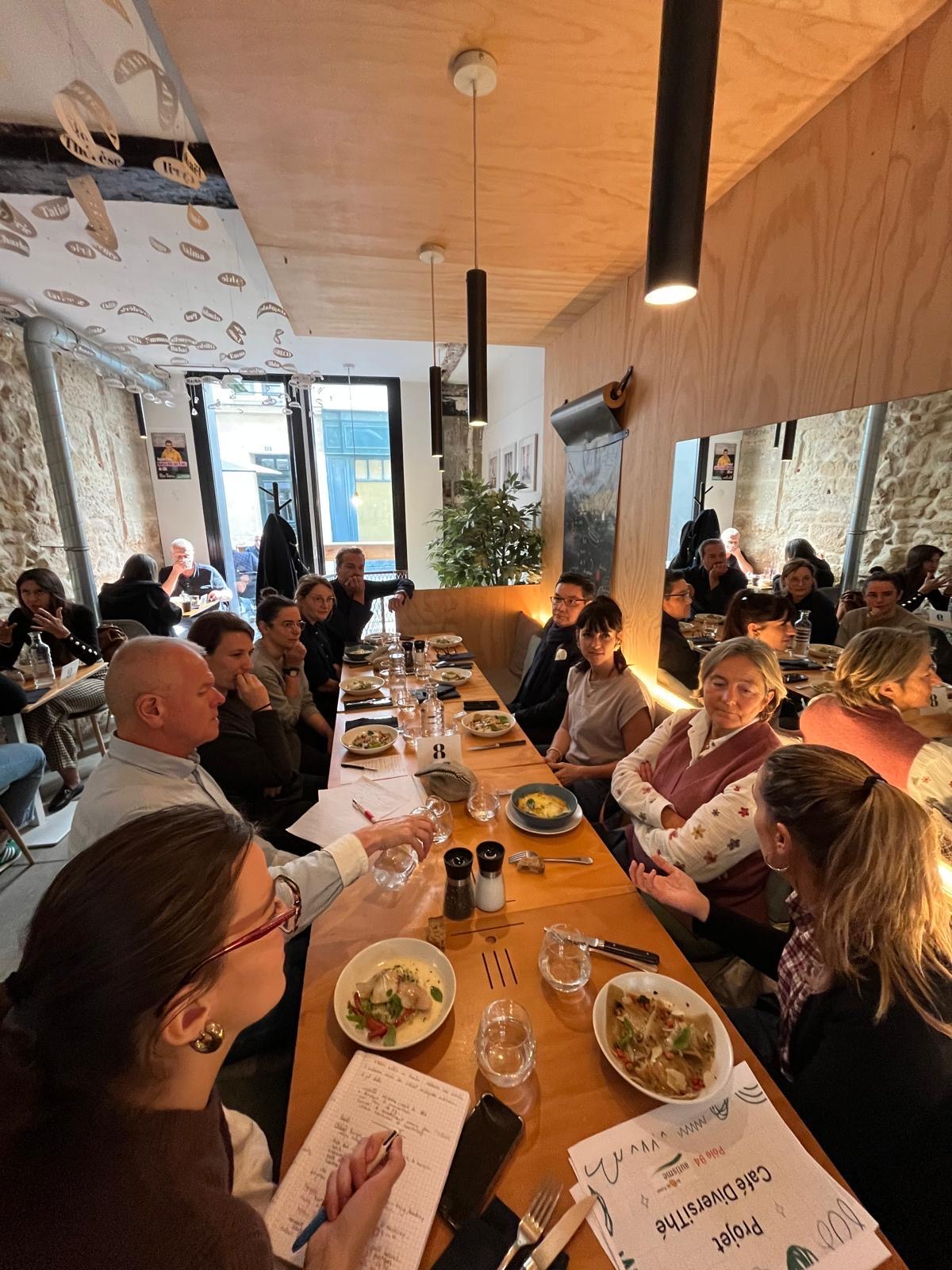 Ces rencontres se déroulent en petit comité, favorisant les échanges entre pairs et permettant de découvrir de manière concrète le fonctionnement du Reflet. Les participants y présentent leur projet, échangent avec Flore Lelièvre, fondatrice du restaurant et bénéficient de son retour d’expérience sur la création, la gestion et le développement d’un restaurant inclusif.